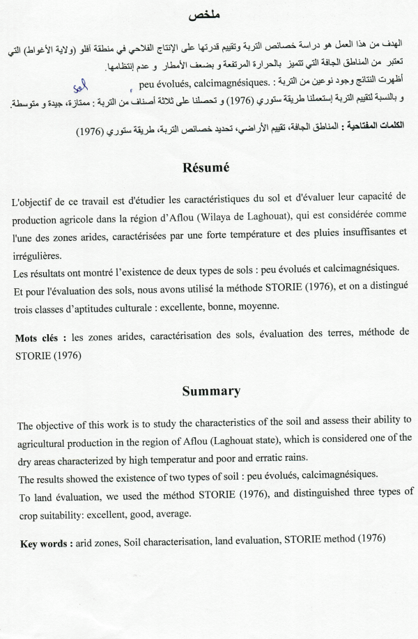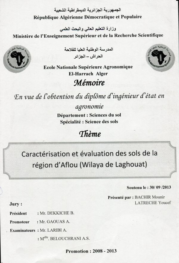 Mém.-ing. : Agron. Ingénieur ENSA : département de Sciences du Sol El Harrach