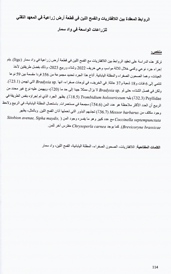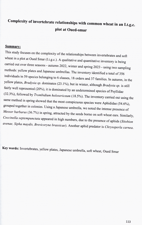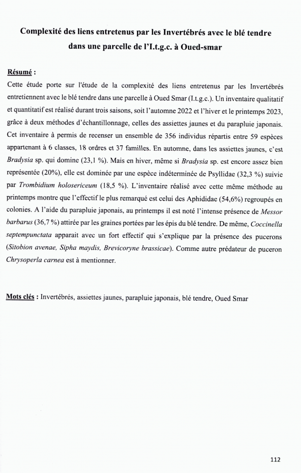 Complexité des liens entretenus par les invertébrés avec le blé tendre dans une parcelle de L'I.T.G.C. d'Oued Smar Amina Nouari