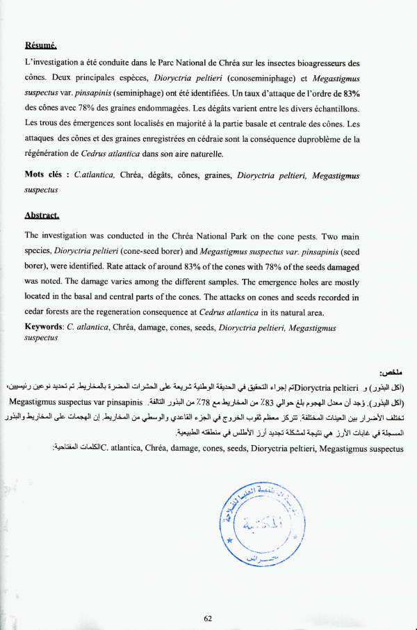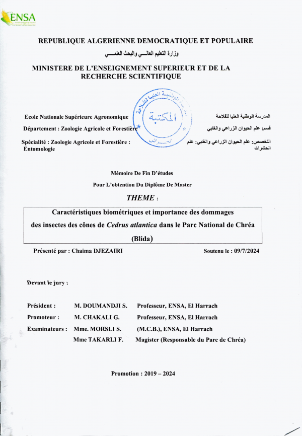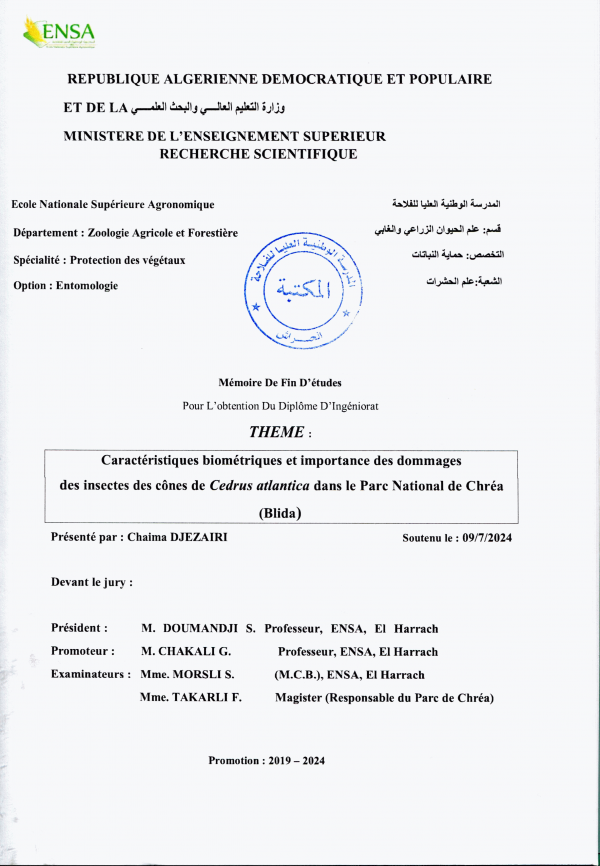 Caractéristiques biométriques et importance des dommages des insectes des cônes de Cedrus atlantica dans le Parc National de Chréa (Blida) Chaima Djezairi
