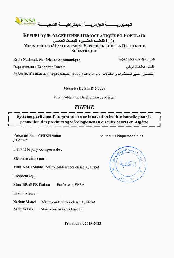 Système participatif de garantie : une innovation institutionnelle pour la promotion des produits agroécologiques en circuits courts en Algérie Salim Chikh