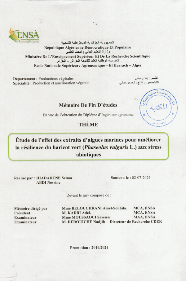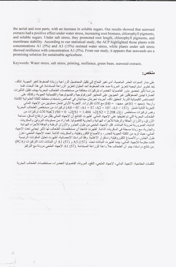 Etude de l'effet des extraits d'algues marines pour améliorer la résilience du haricot vert (Phaseolus vulgaris L.) aux stress abiotiques Selma Ihadadene , Nesrine Abdi