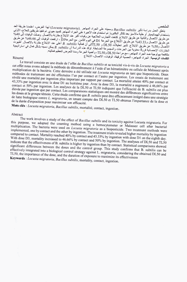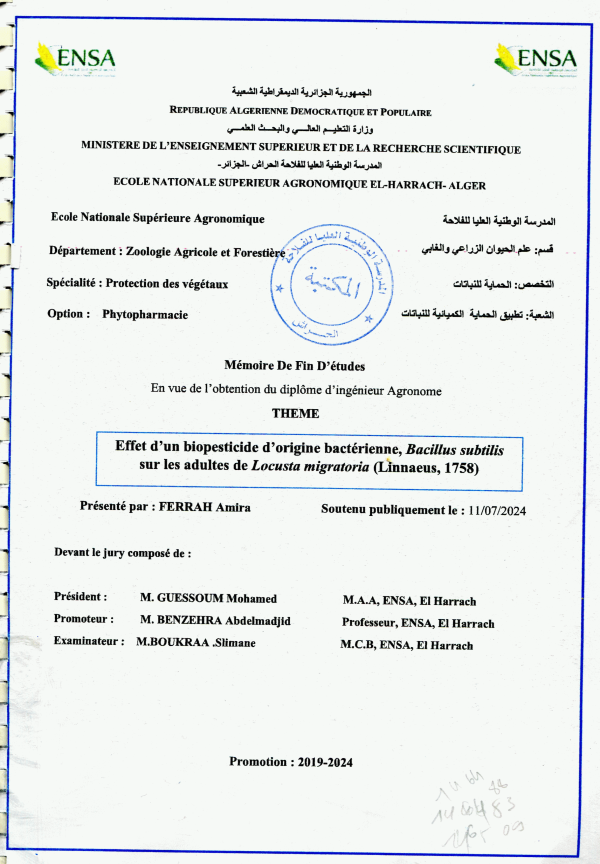 Effet d'un biopesticide d'origine bactérienne, bacillus subtilis sur les adultes de locusta migratoria (linnaeus, 1758) Amira Ferrah