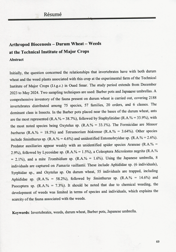 Biocénose Arthropodes - Blé dur - Adventices à l'Institut Technique des Grande Culture Rosa Labbaci