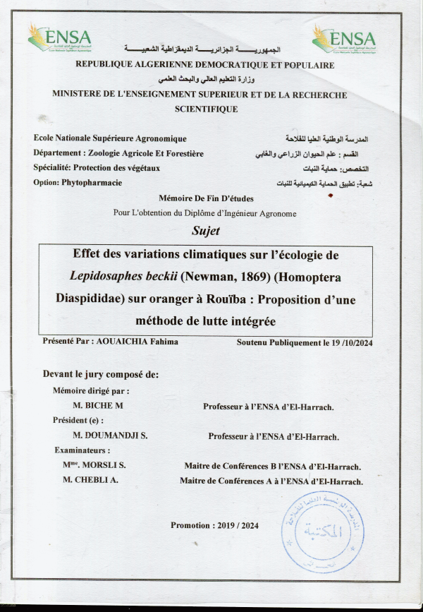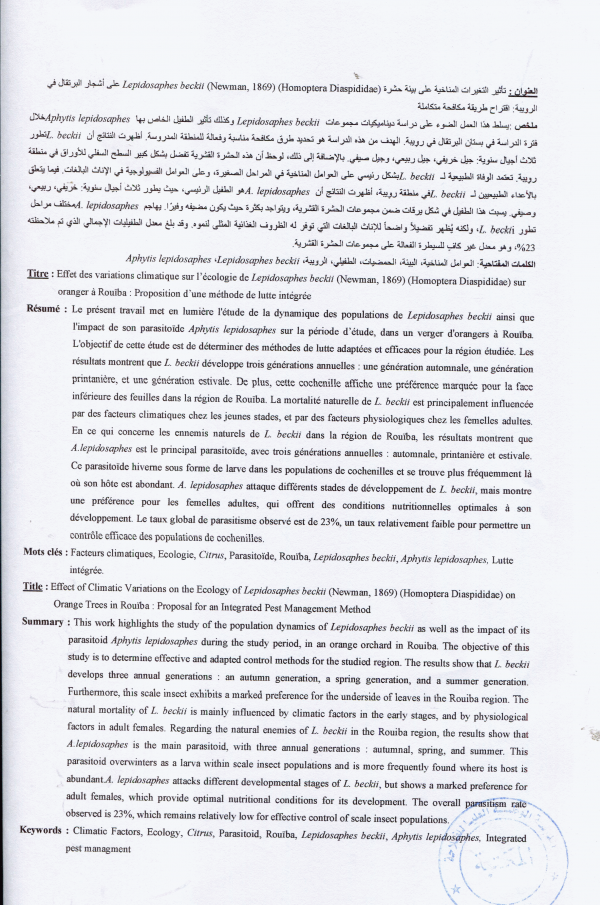 Effet des variations climatiques sur l'écologie de lepidosaphes beckii (Newman,1869) (Homoptera Diaspididae) sur oranger à Rouiba proposition d'une méthode de lutte intégrée Fahima Aouaichia