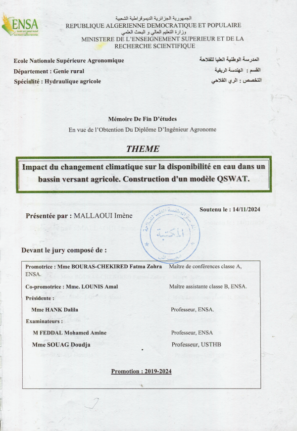Impact du changement climatique sur la disponibilité en eau dans un bassin versant agricole construction d'un modèle QSWAT Imène Mallaoui