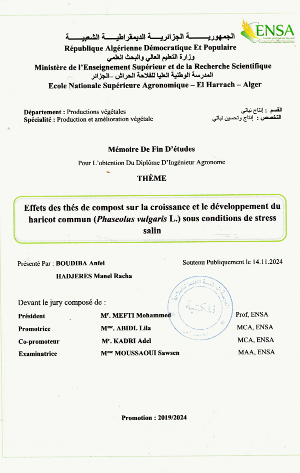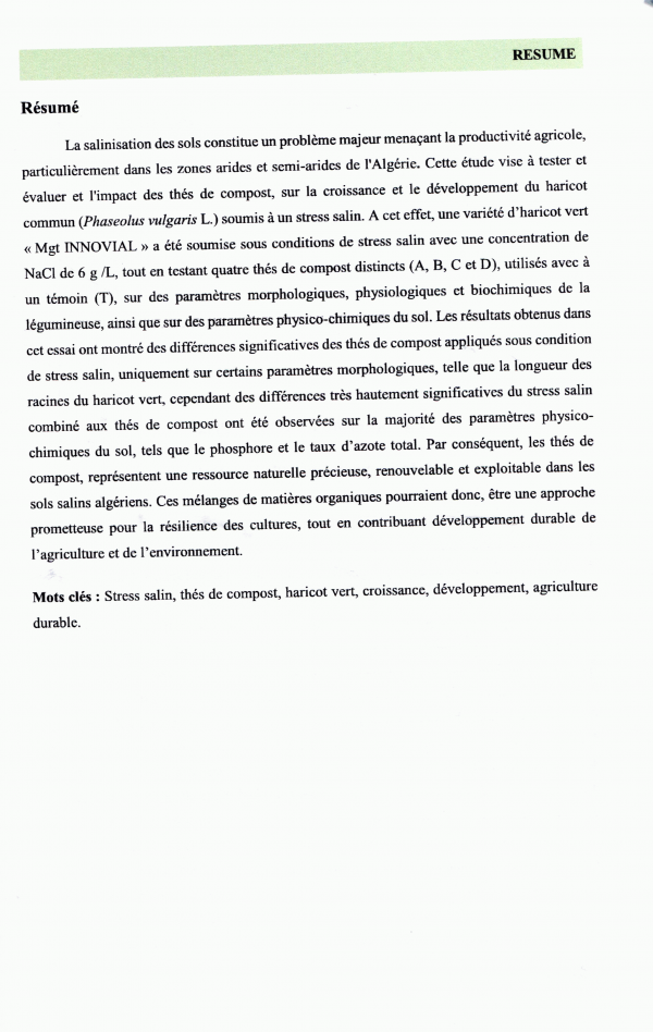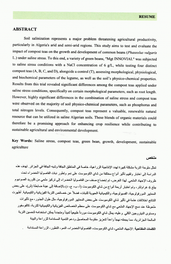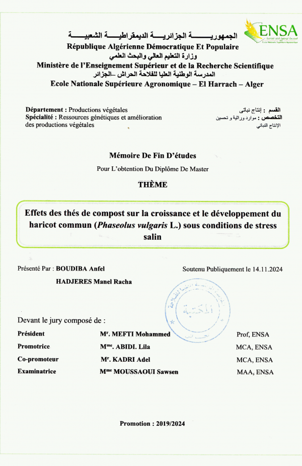 Effets de thés de compost sur la croissance et le développement du haricot commun (Phaseolus vulgaris L.) sous conditions de stress salin Anfel Boudiba, Manel Racha Hadjeres
