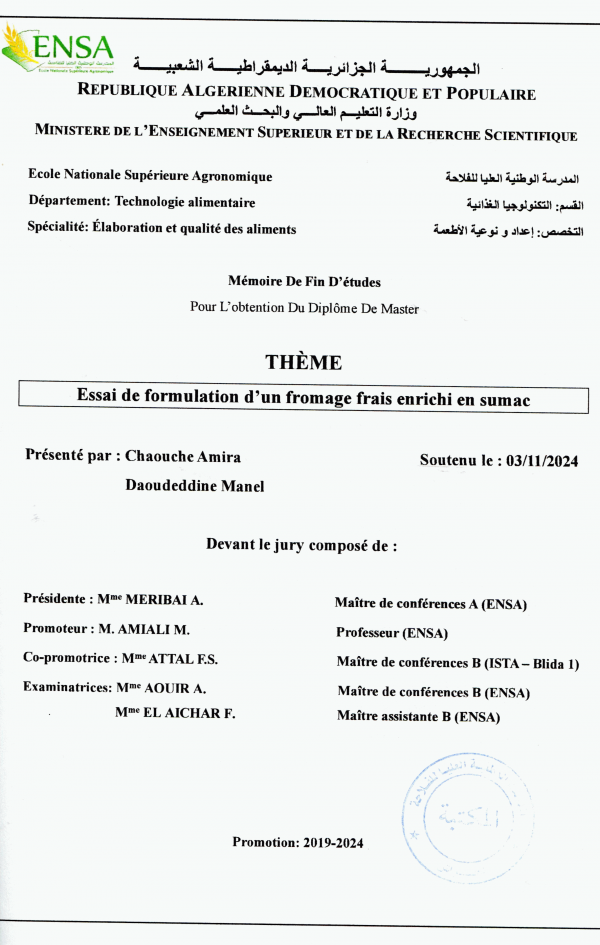 Mém.-ing./Master : Agron. Ingénieur/Master ENSA : département de Technologie Alimentaire et Nutrition Humaine El-Harrach