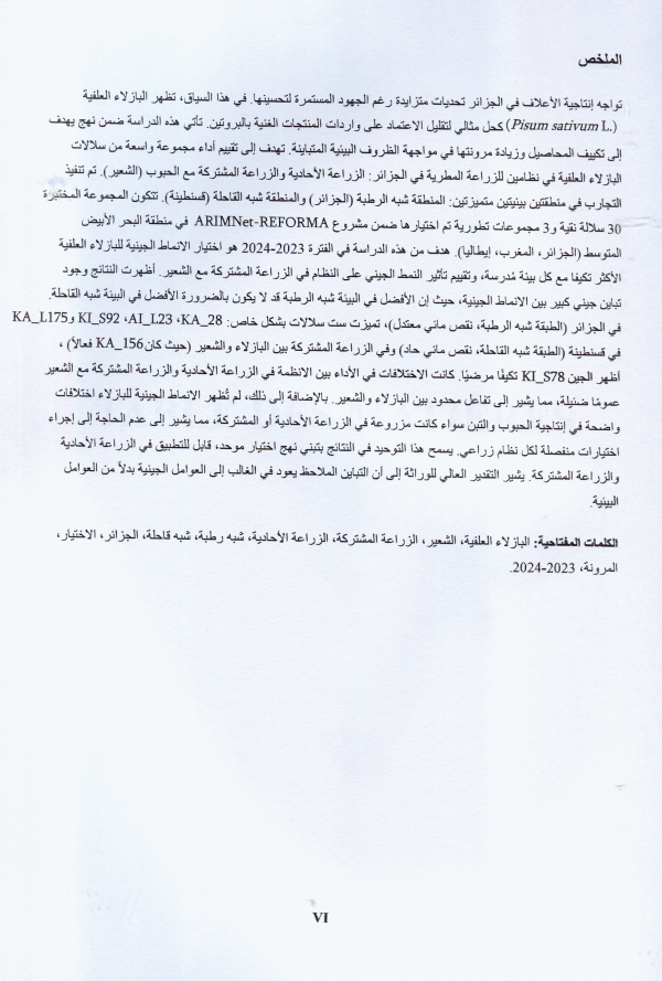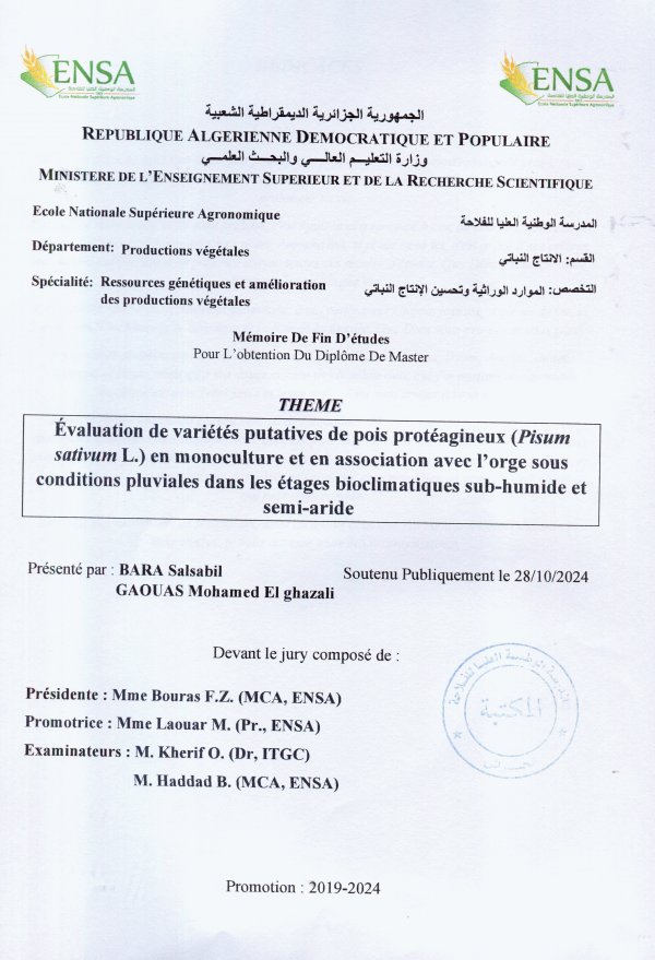 Évaluation de variétés putatives de pois protéagineux (Pisum sativum L.) en monoculture et en association avec l'orge sous conditions pluviales dans les étages bioclimatiques sub-humide et semi-aride Salsabil Bara, Mohamed El Ghazali Gaous