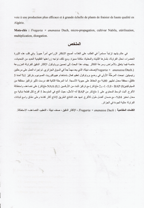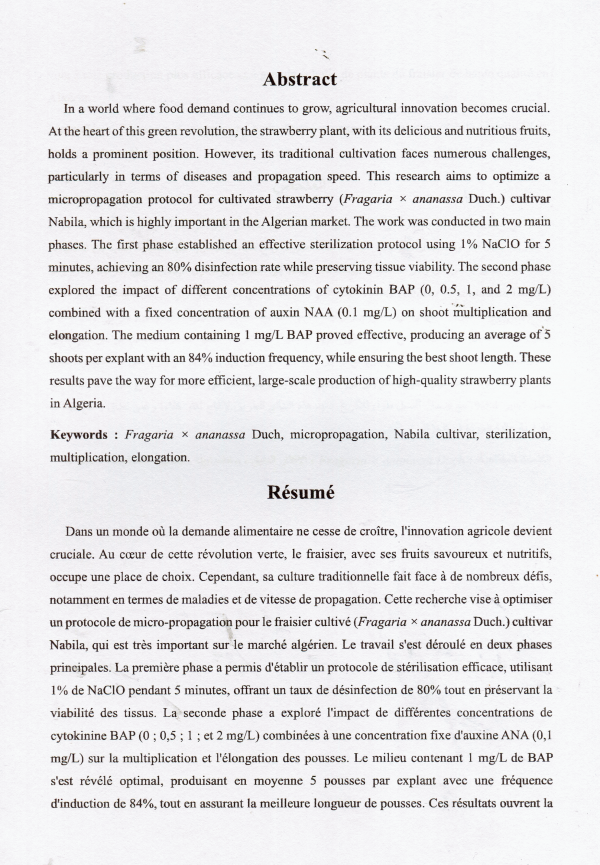 Optimisation du protocole de micro-propagation de la variété de fraisier (Fragria xananassa Duch.) <<Nabila>> cultivée en Algérie Fatima Zohra Boukhatem