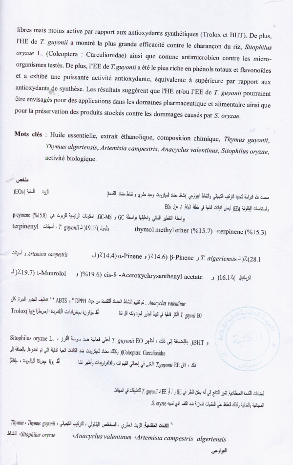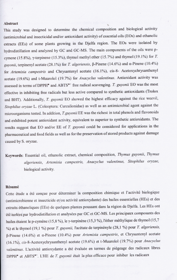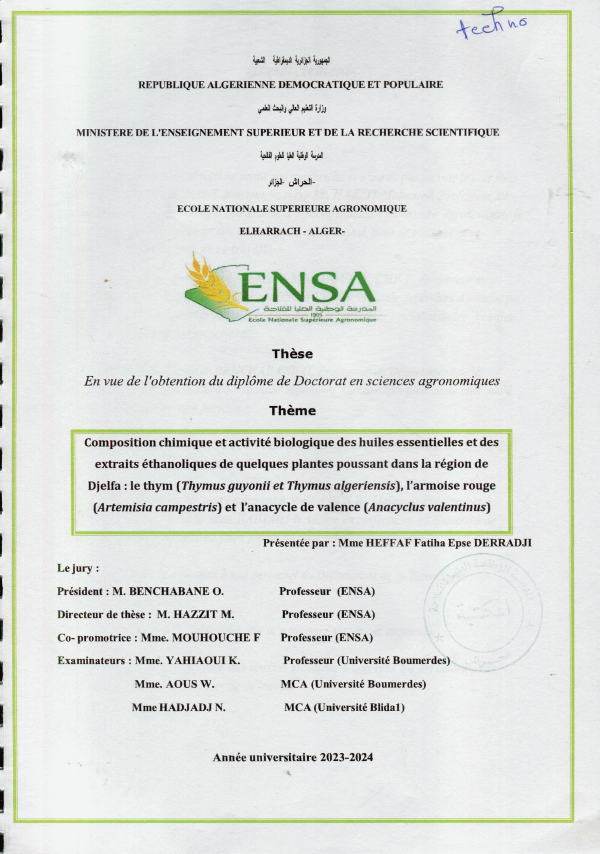 Composition chimique et activité biologique des huiles essentielles et des extraits éthanoliques de quelques plantes poussant dans la région de Djelfa le thym (Thymus guyonii et Tymus algeriensis), l'armoise rouge (Artemisia campestris) et l'anacycle de valence (Anacyclus valentinus) Fatiha Heffaf epse Derradji