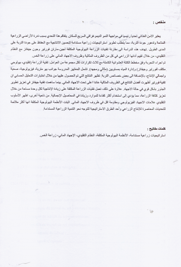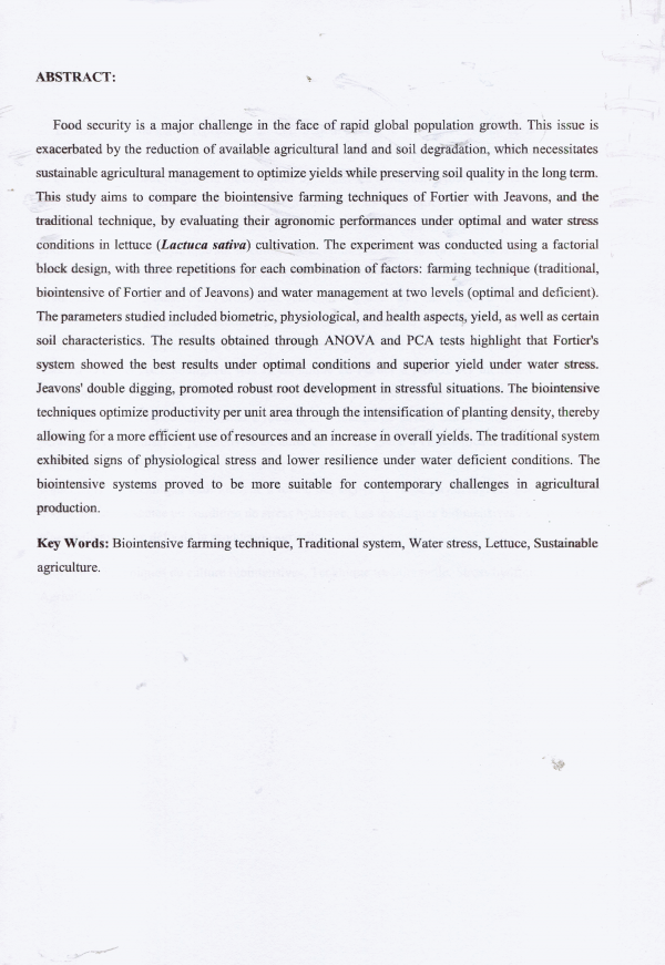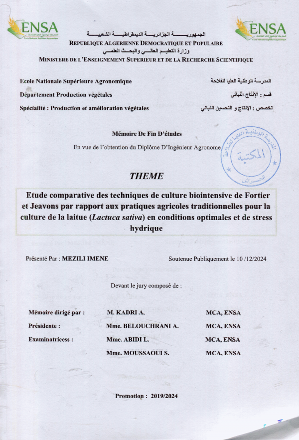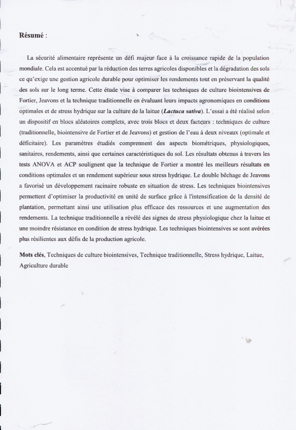 Etude comparative des techniques de culture biointensive de Fortier et Jeavons par rapport aux pratiques agricoles traditionnelles pour la culture de la laitue (Lactuca sativa) en conditions optimales et de stress hydrique Imene Mezili