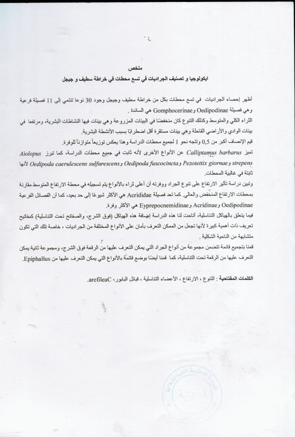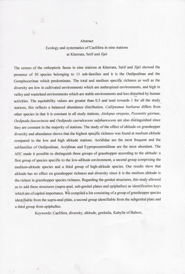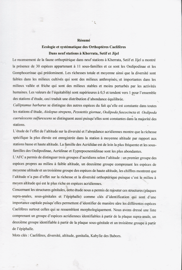 Systématique et écologie des orthoptères Caelifères dans neuf stations à Kherrata, Setif et Jijel Ammar Azil