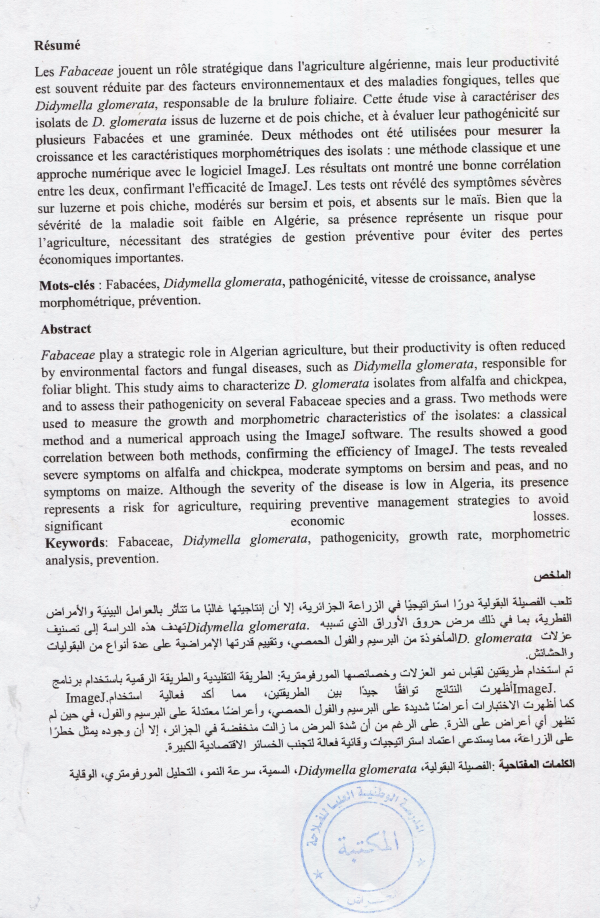 Caracterisation phenotypique et evaluation de la pathogenicite de quelques isolats de didymella glomerata sur quelques especes de fabaceae Romaissa, Boutaleb