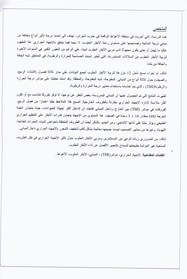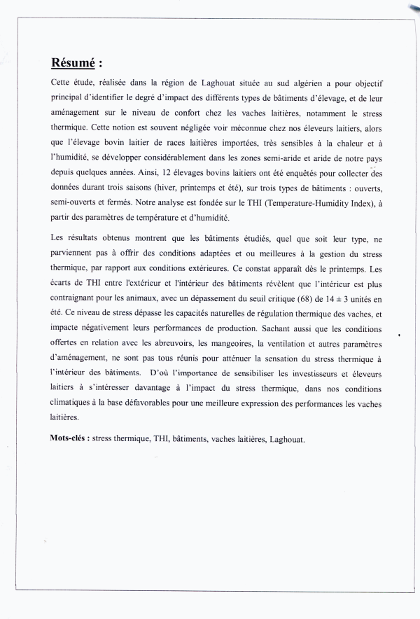 Impact de la conception et de l'aménagement des bâtiments d'élevage sur le stress thermique chez les vaches laitières dans la région de laghouat Widad Lakehal