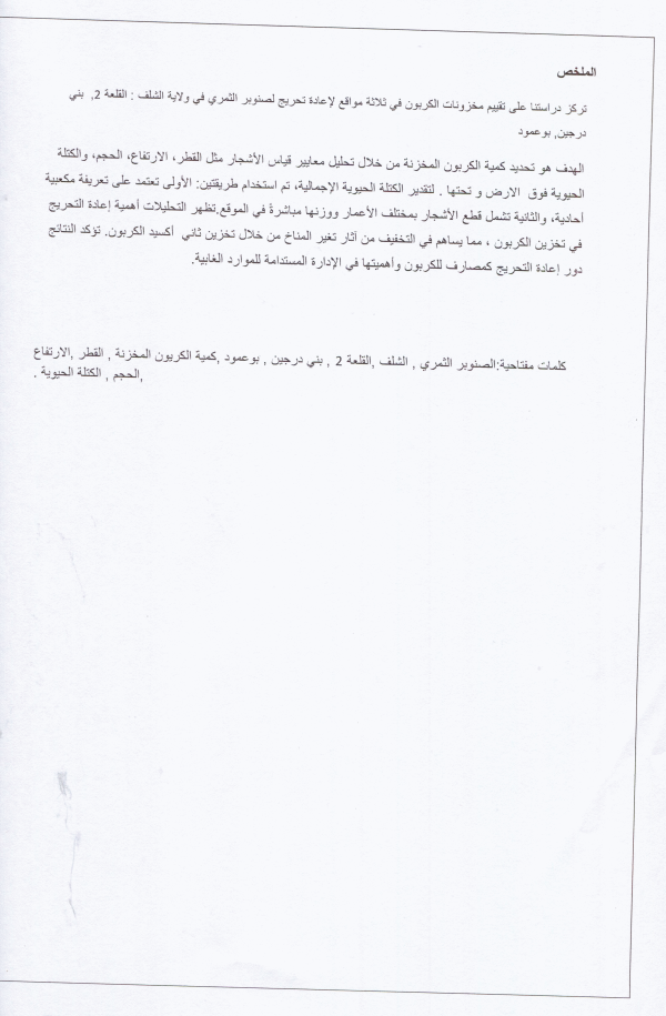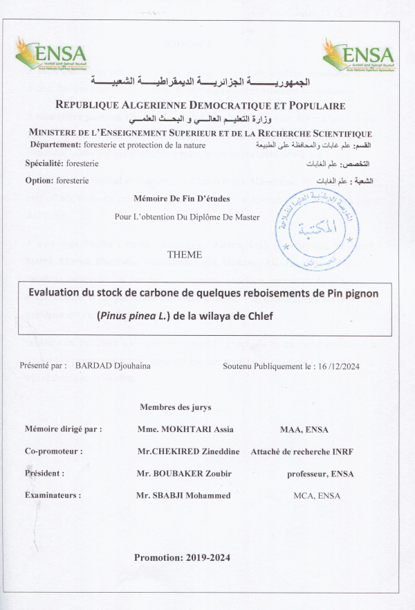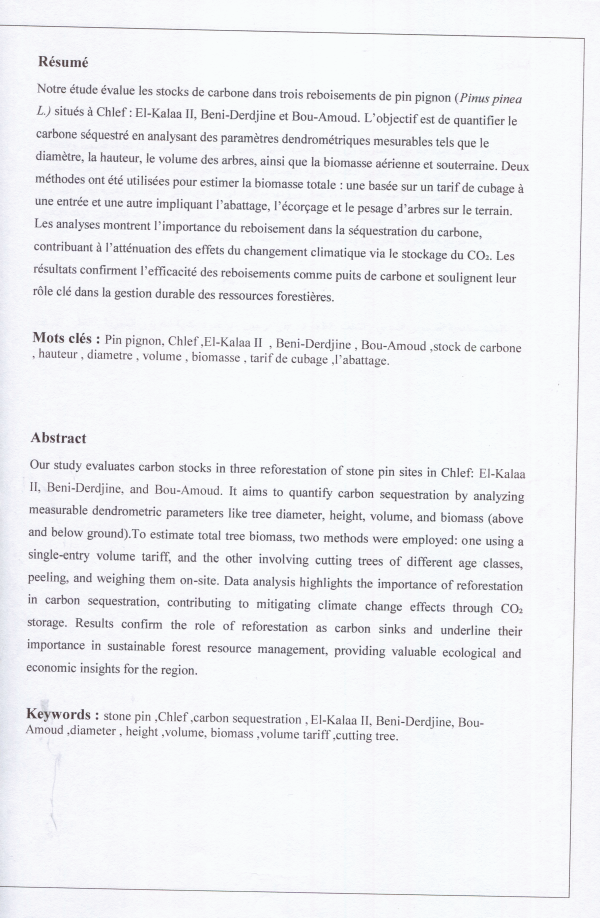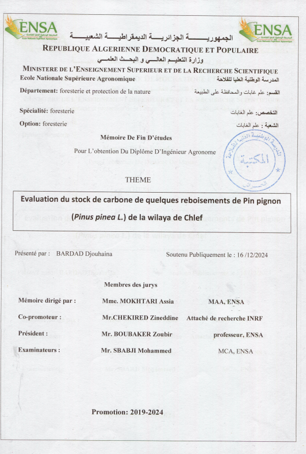 Evaluation du stock de carbone e quelques reboisements de pin pignon (pinus pinea L.) de la wilaya Chlef Djouhaina Bardad