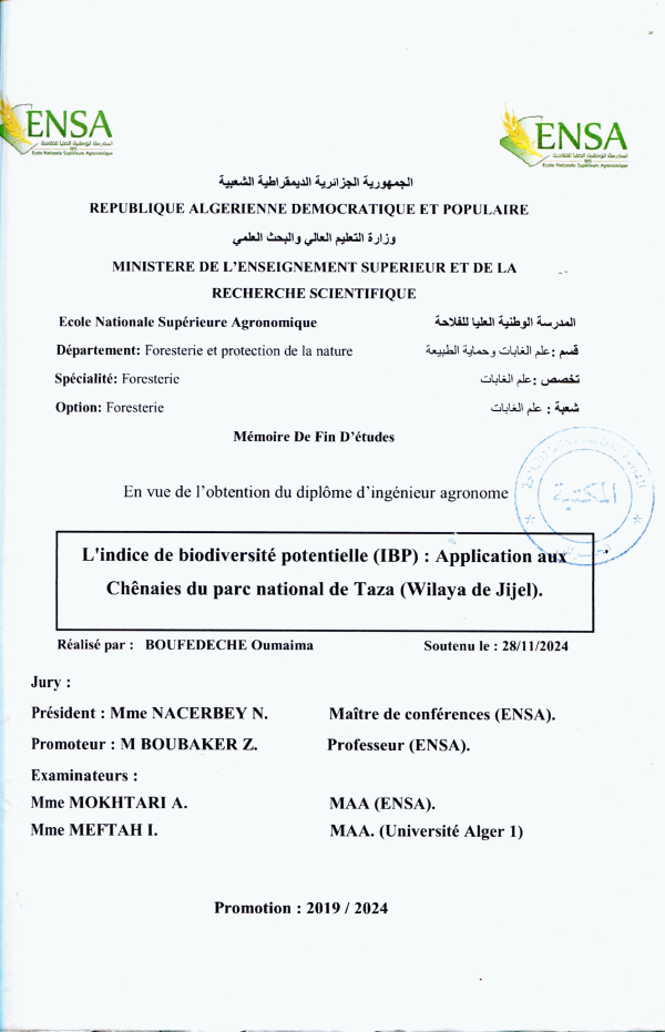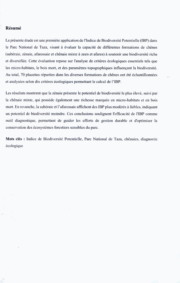 L'indice de biodiversité potentielle (IBP) : application aux Chênaies du parc national de Taza (Wilaya de Jijel) Oumaima Boufedeche