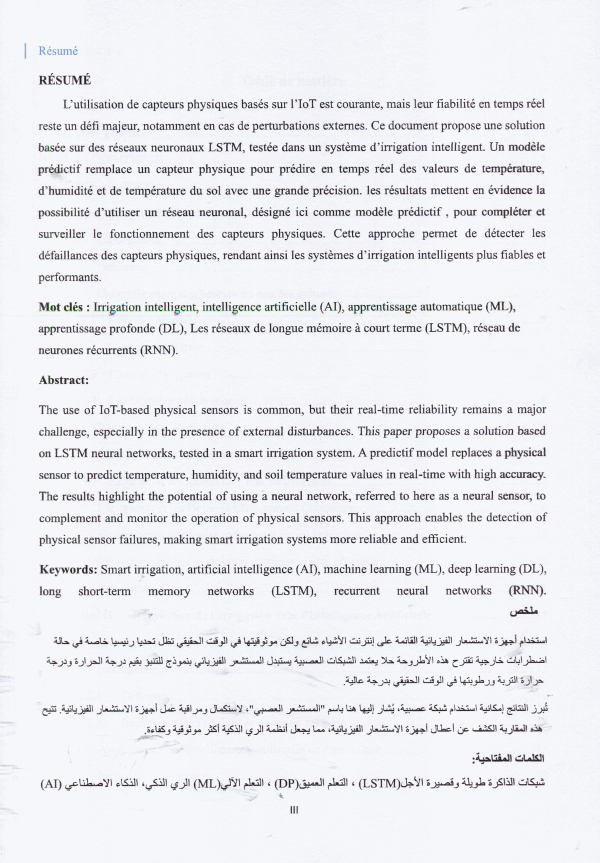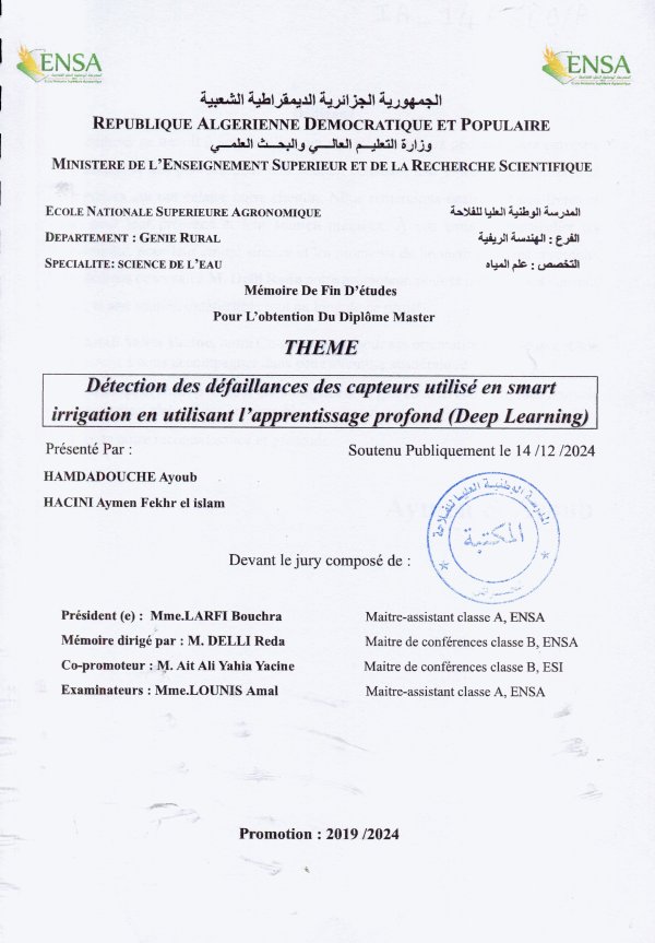 Détection des défaillances des capteurs utilisé en smart irrigation en utilisant l'apprenstissage profond (Deep Learning) Ayoub Hamdadouche, Aymen Fekhr El Islam Hacini