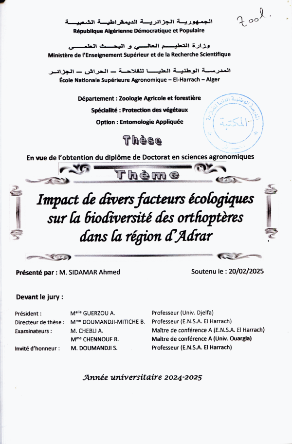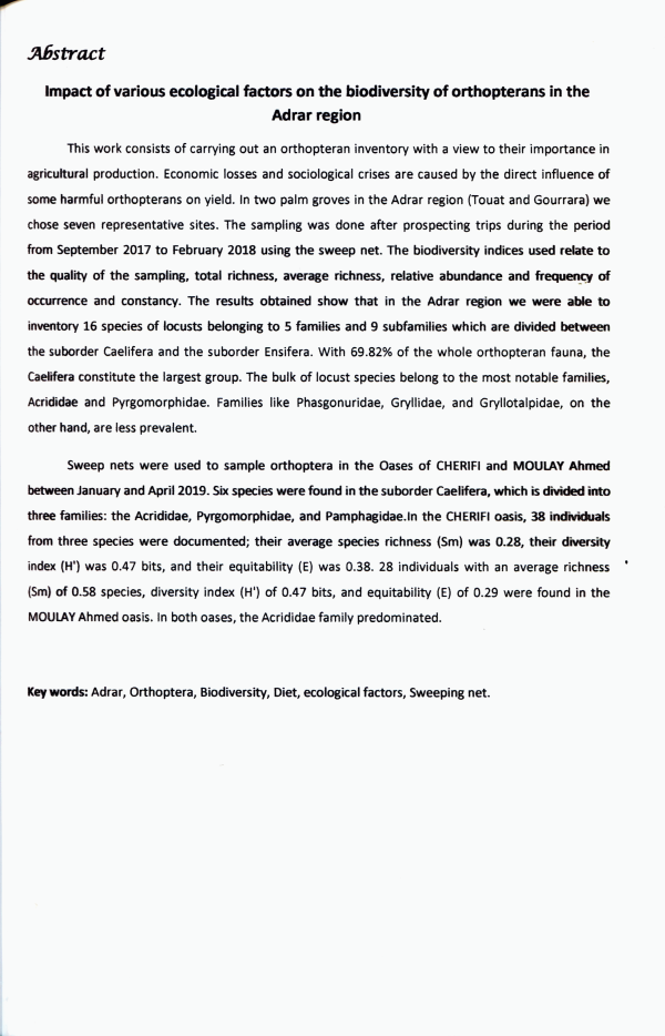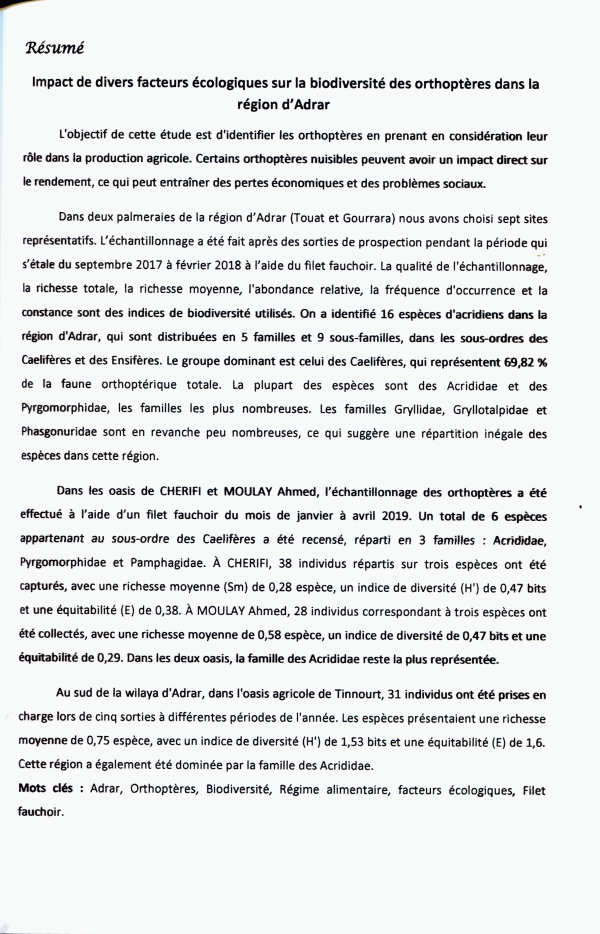 Impact de divers facteurs écologiques sur la biodiversité des orthoptères dans la région d'Adrar Ahmed Sidamar