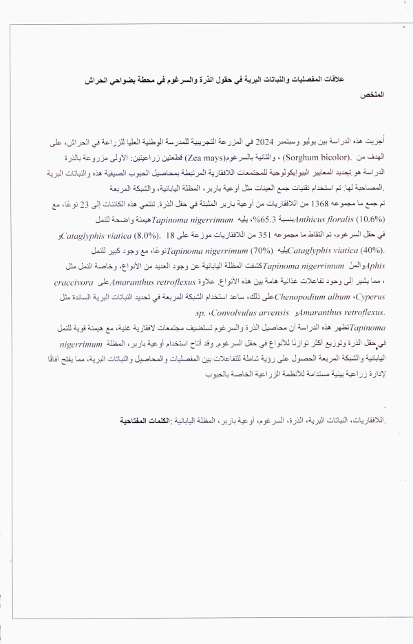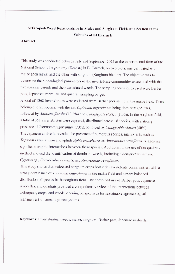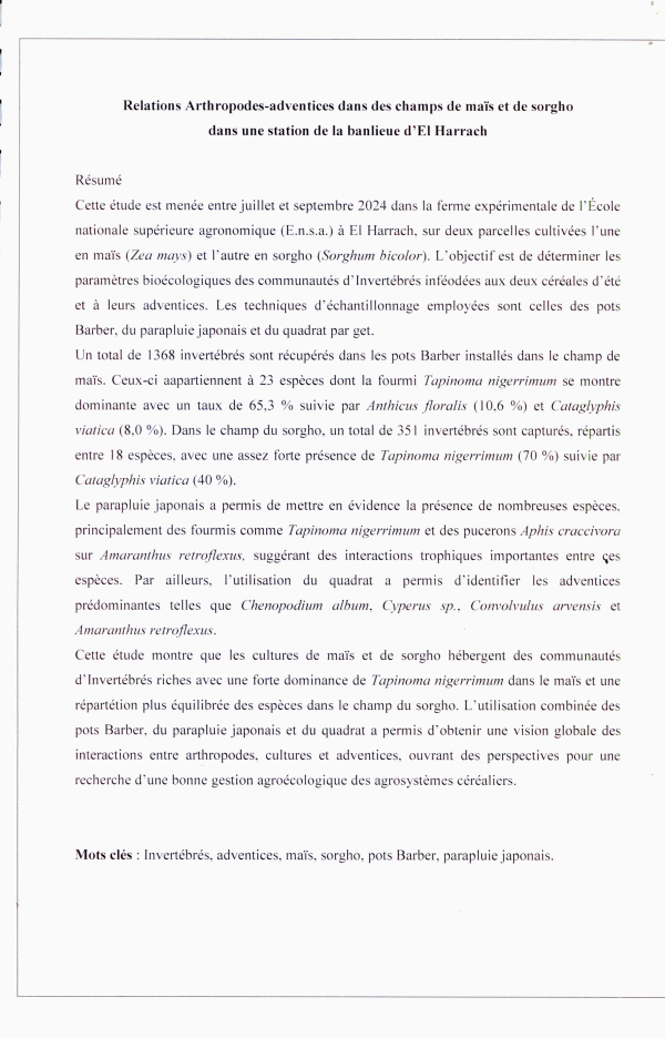 Relations des Arthropodes avec les adventices inféodées aux céréales d'été (maïs et sorgho) dans la banlieue d'El Harrach Ibtihel Menzer