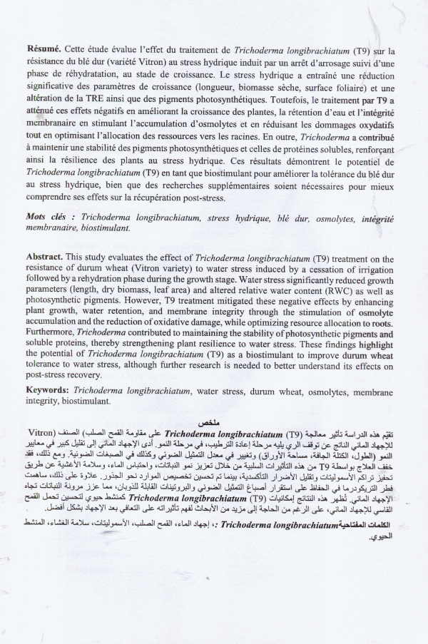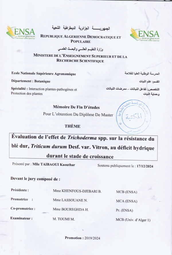 Evaluation de l'effet de Trichoderma spp. sur la résistance du blé dur, Triticum durum Desf. var. Vitron, au déficit hydrique durant le stade de croissance Kaouthar Taibaoui