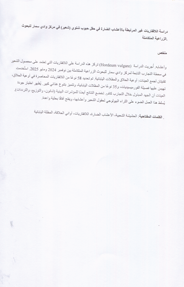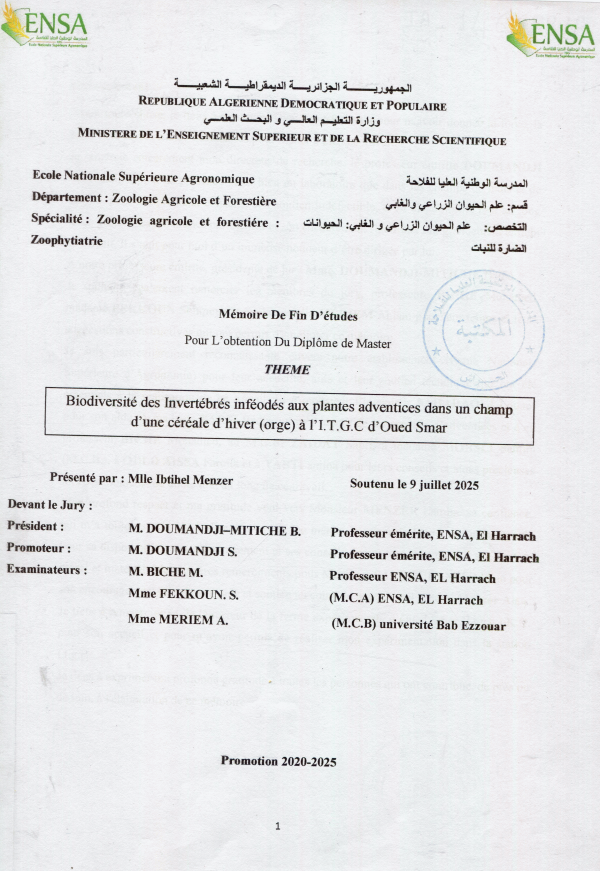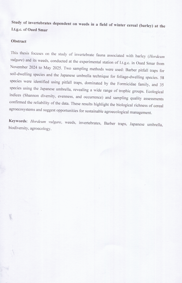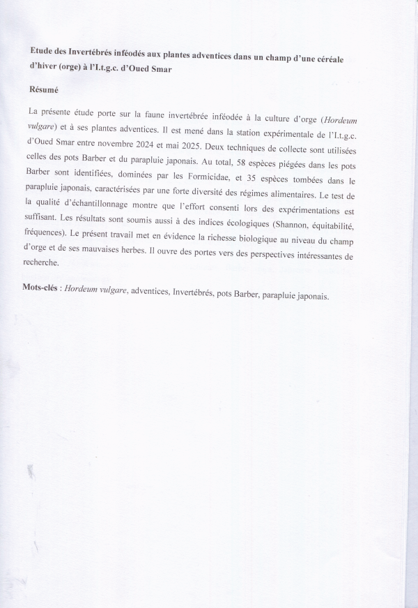 Biodiversité des invertébrés inféodés aux plantes adventices dans un champ d'une céréale d'hiver (orge) à l'I. T. G. C d'Oued Smar Ibtihel Menzer
