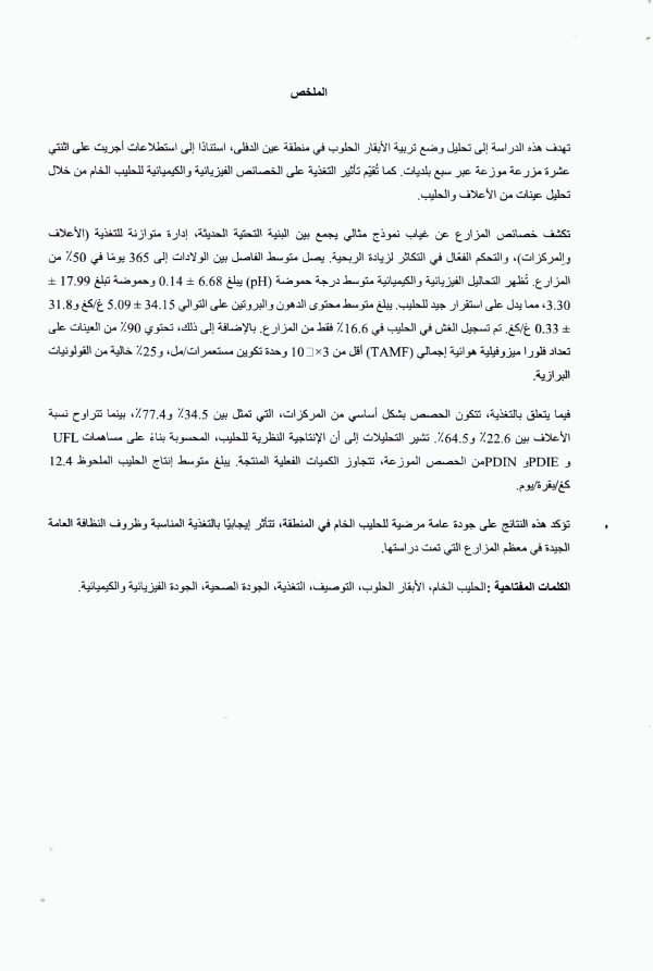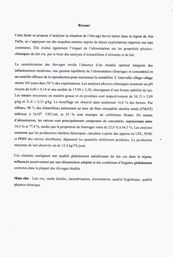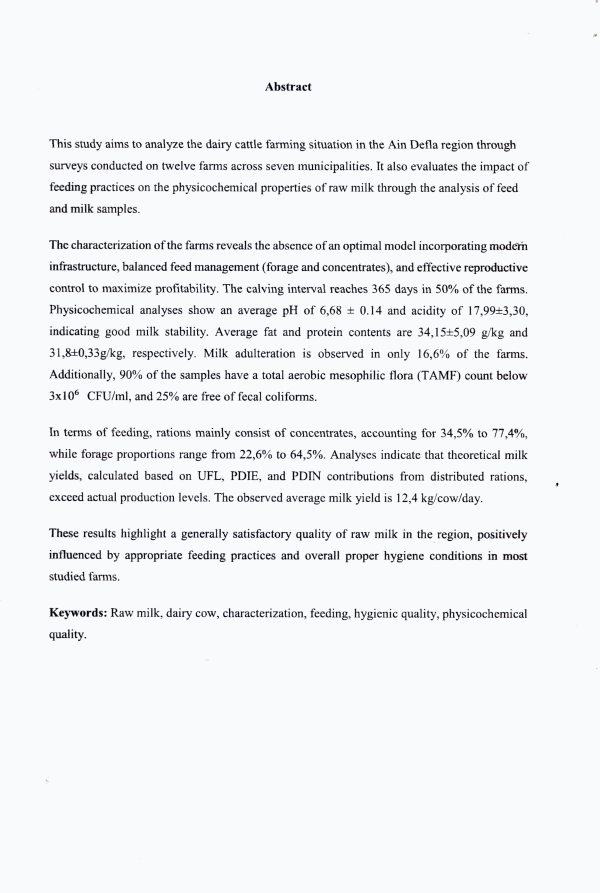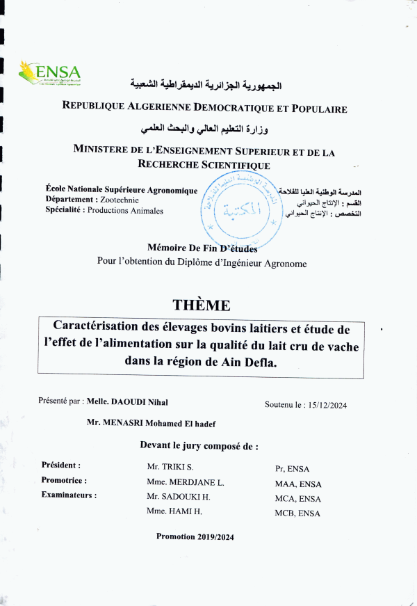 Caractérisation des élevages bovins laitiers et étude de l'effet de l'alimentation sur la qualité du lait cru de vache dans la région de Ain Defla Nihal Daoudi, Mohamed El hadef Menasri