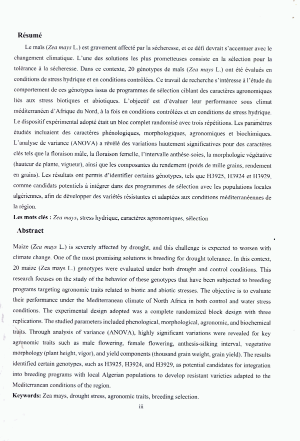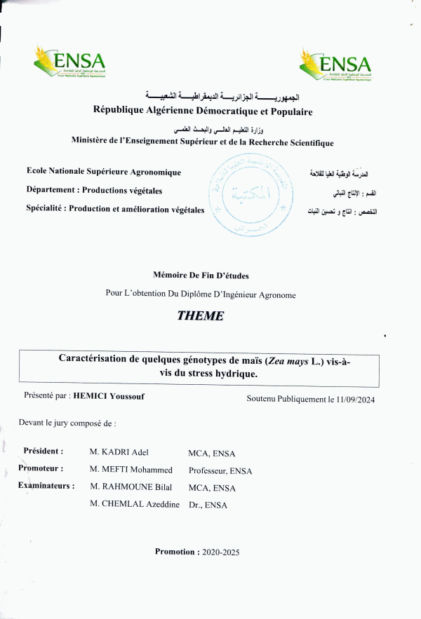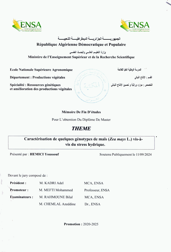 Caractérisation de quelques génotypes de maïs (Zea mays L.) vis-à-vis du stress hydrique Youssouf Hemici