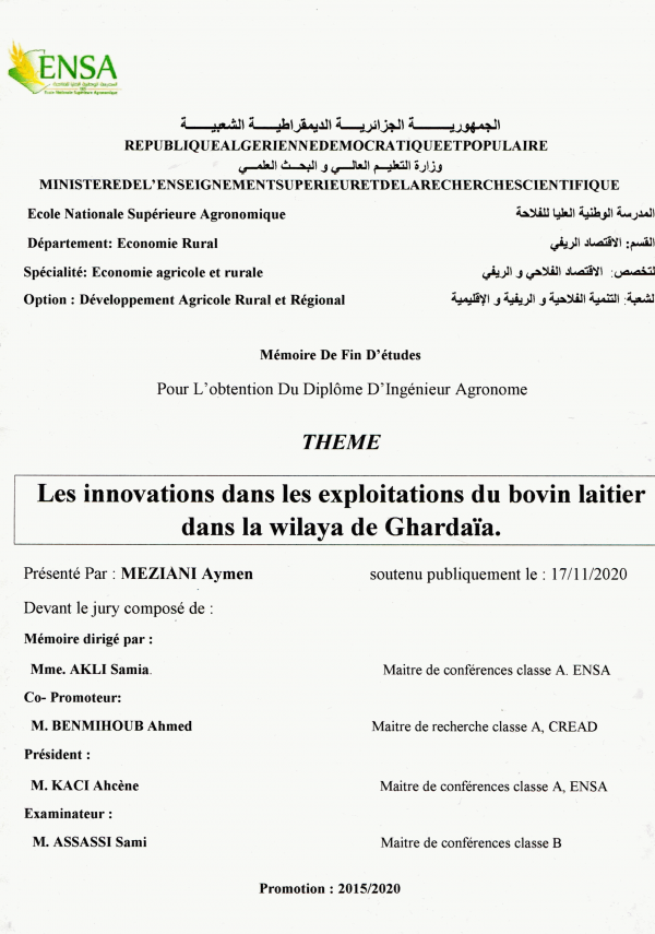 Adresse: Ecole Nationale Supérieure Agronomique Hassen Badi - El Harrach Alger, Algérie