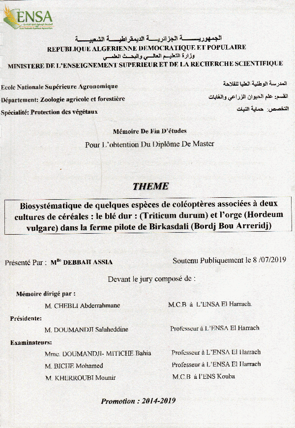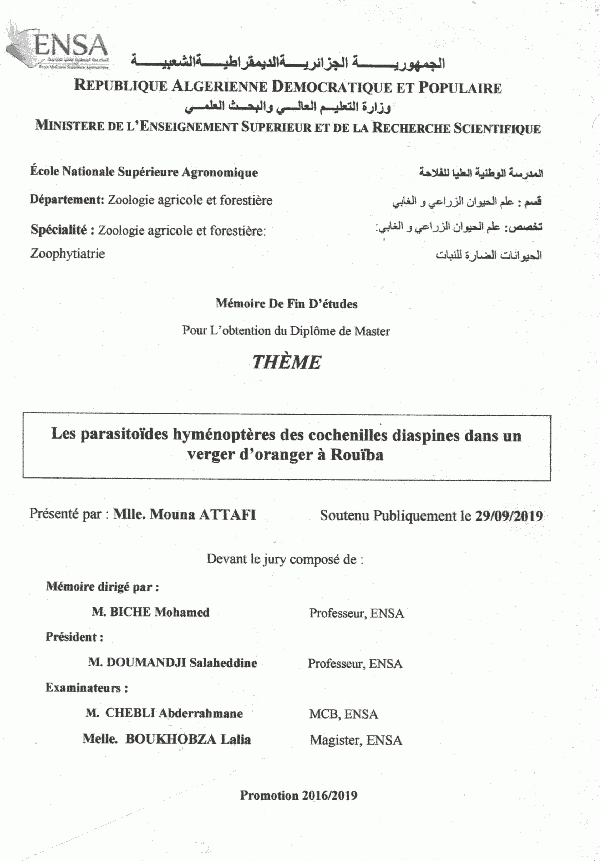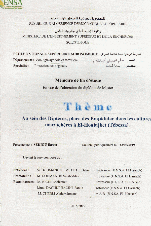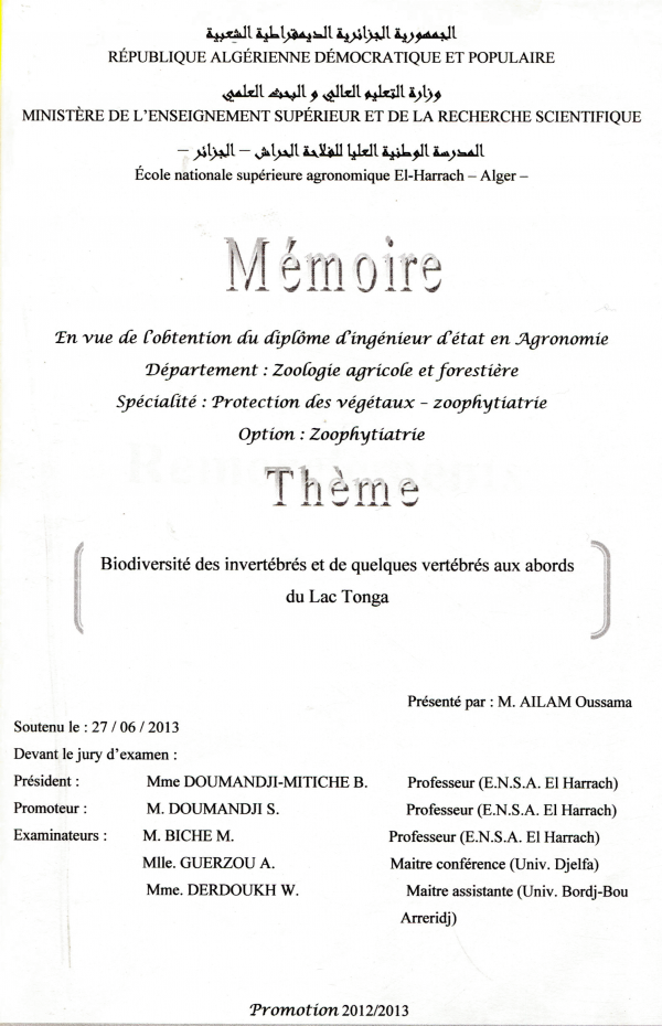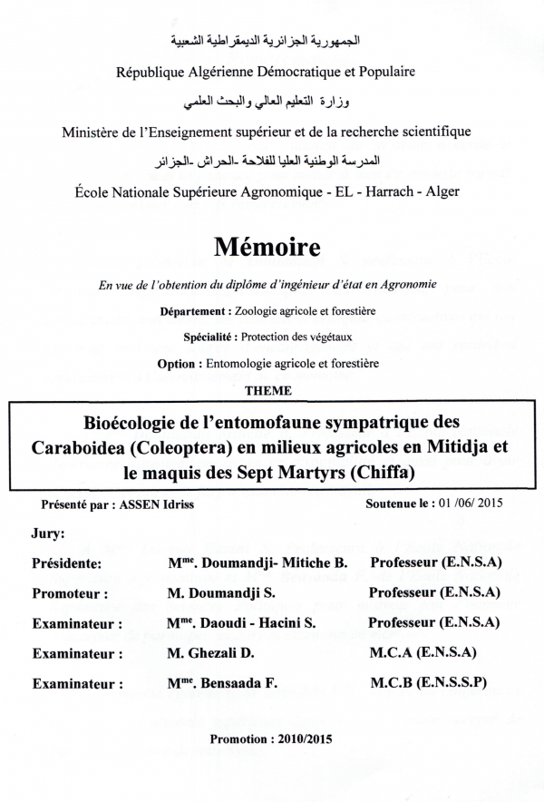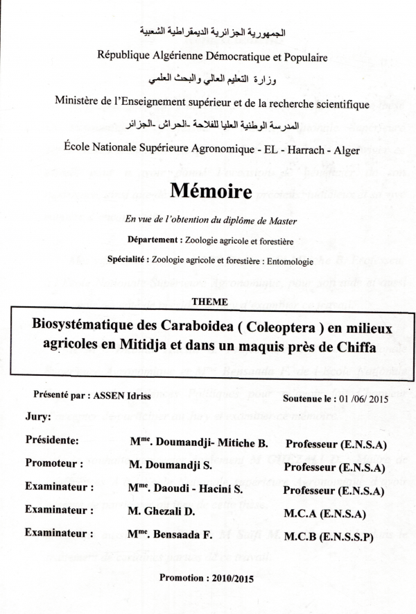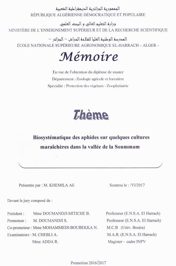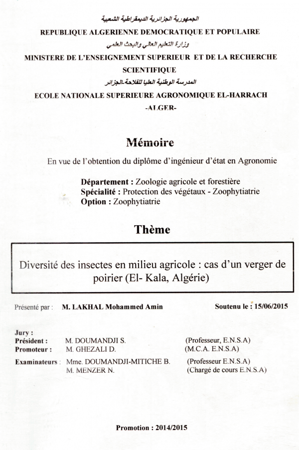 Note de thèse : Mém.-Master : Agron. Master ENSA : département de Zoologie Agricole