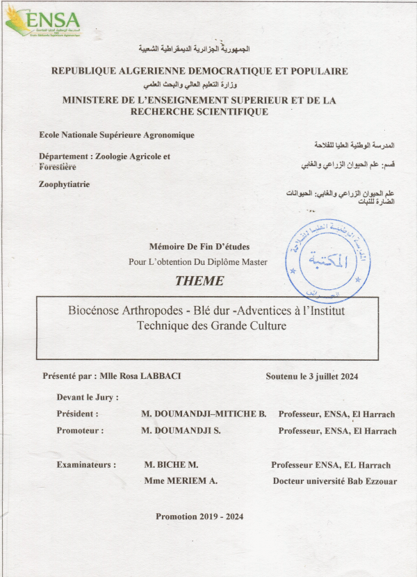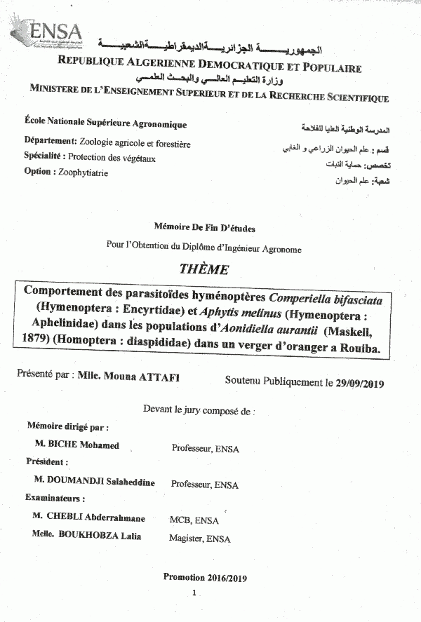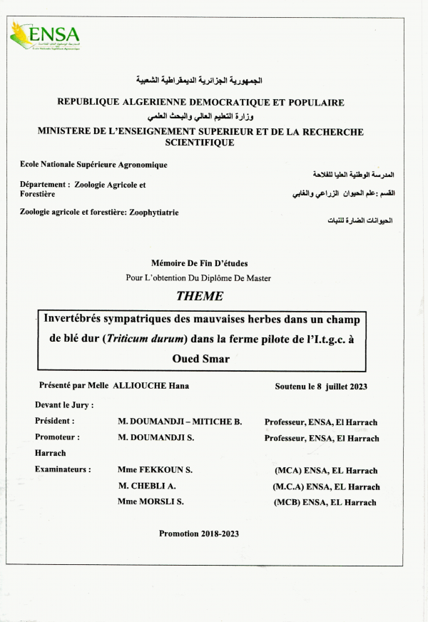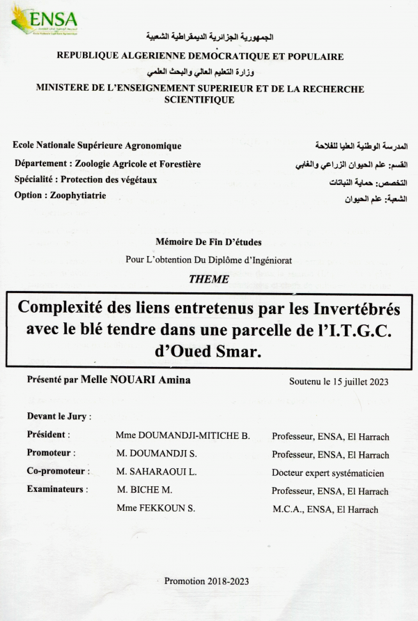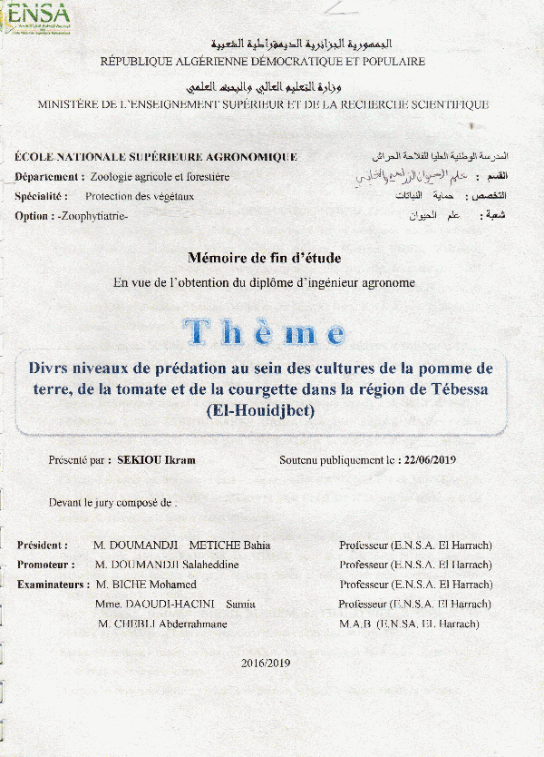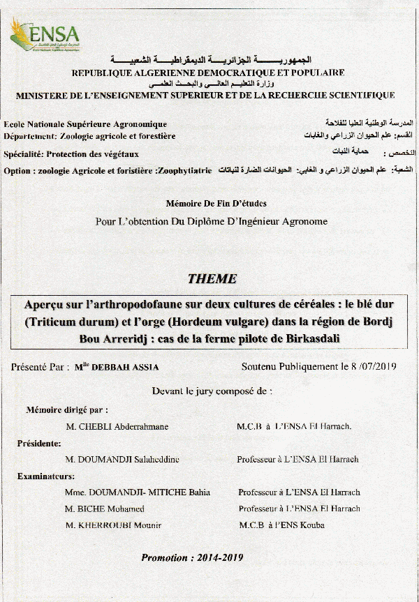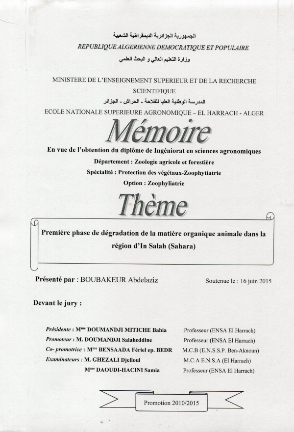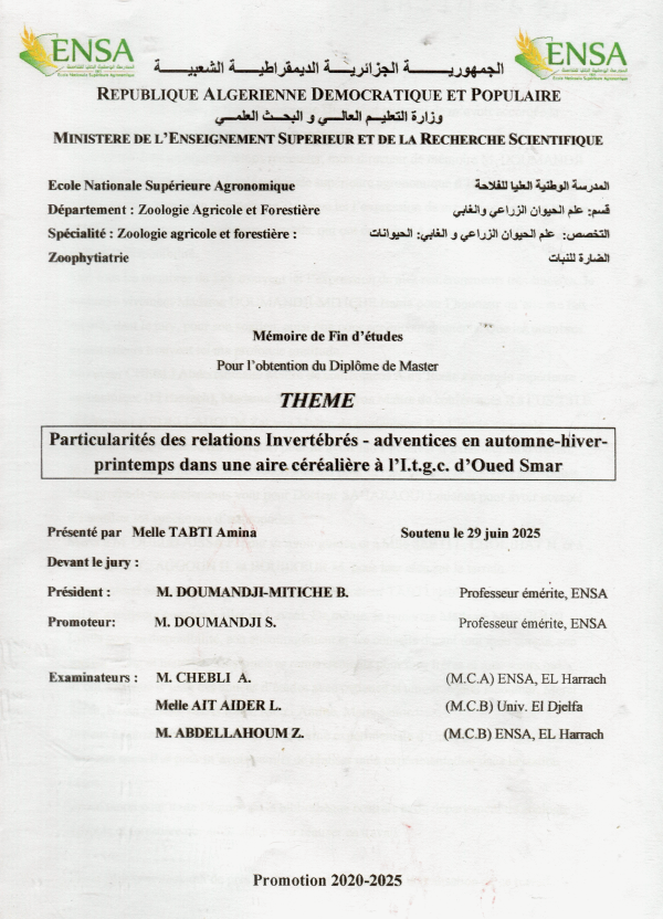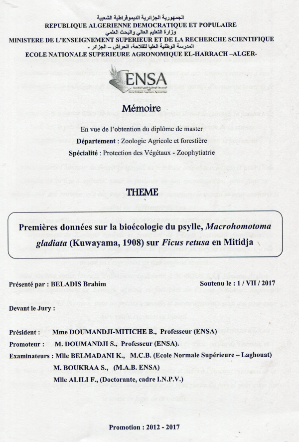 Note de thèse : Mém.-Master : Agron. Master ENSA : département de Zoologie Agricole