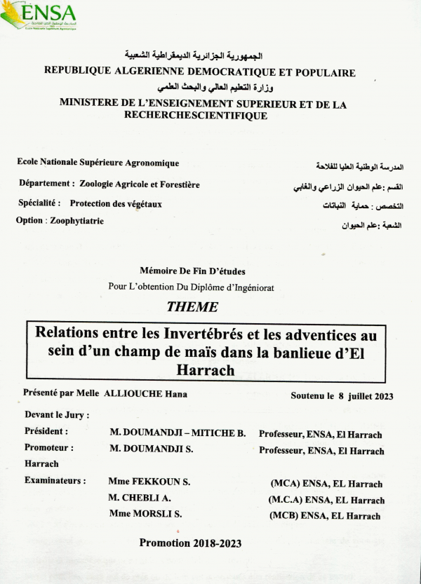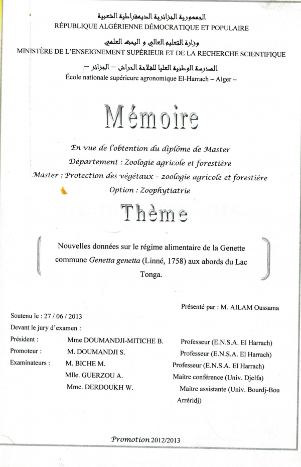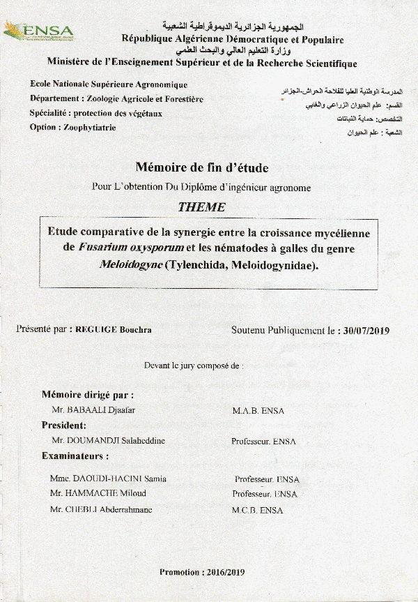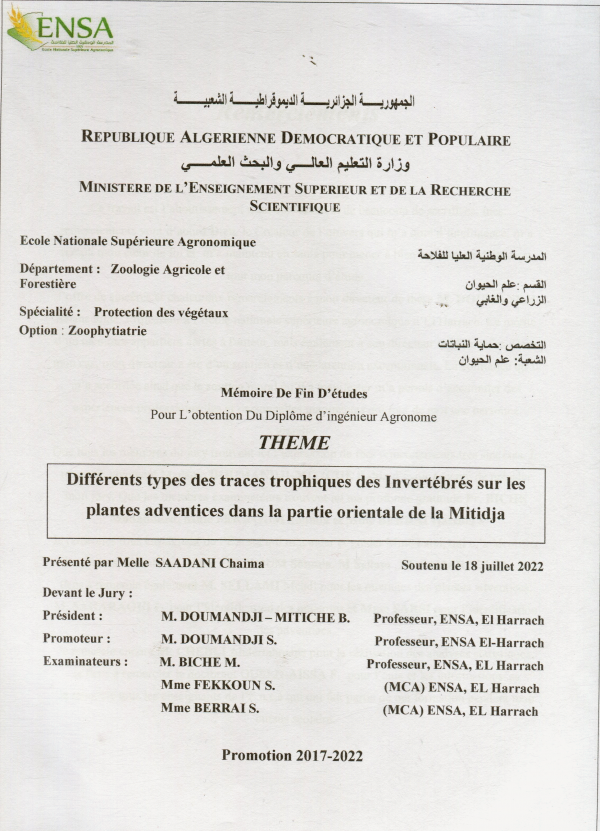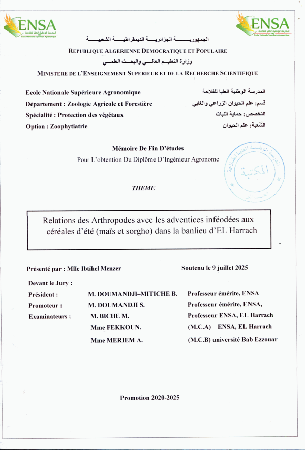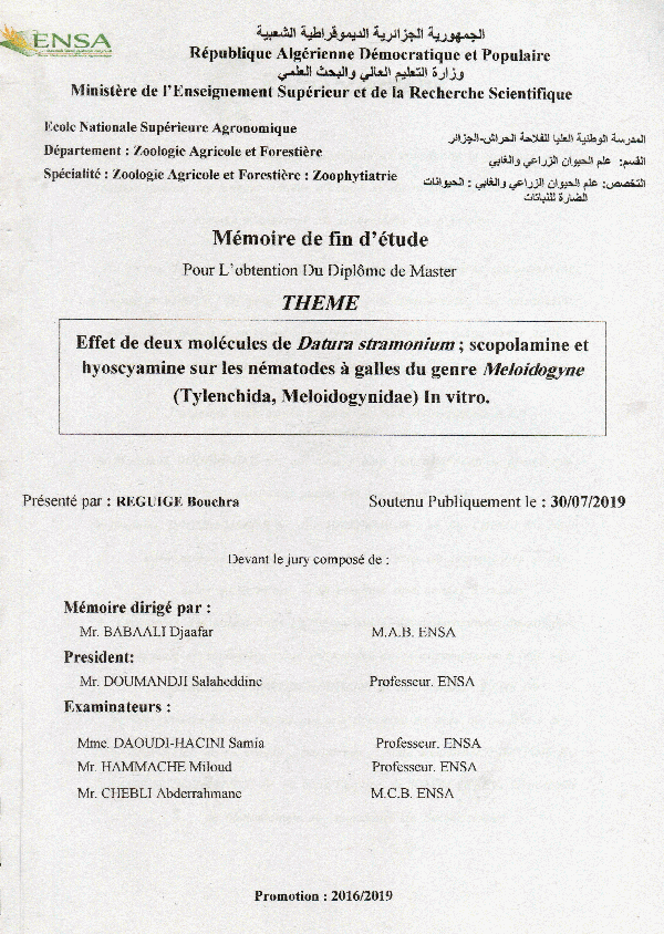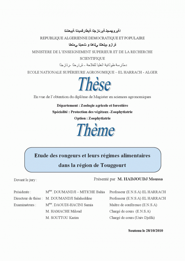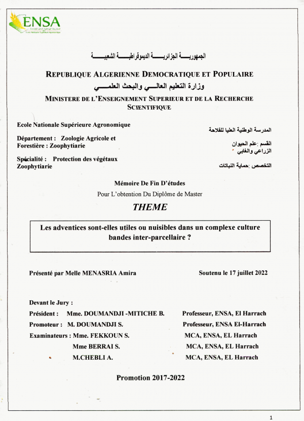 Note de thèse : Mém.-Master : Agron. Master ENSA : département de Zoologie Agricole