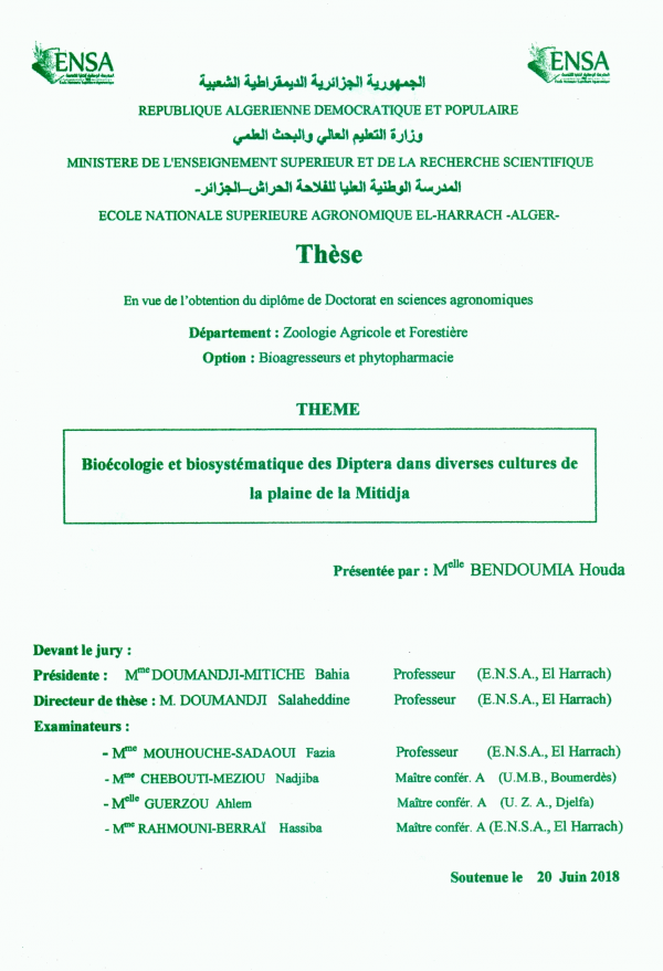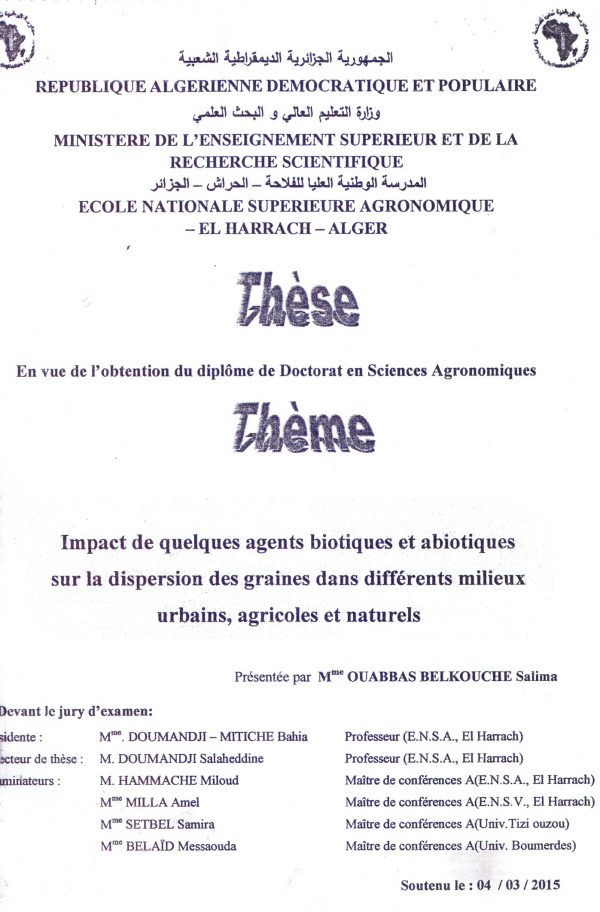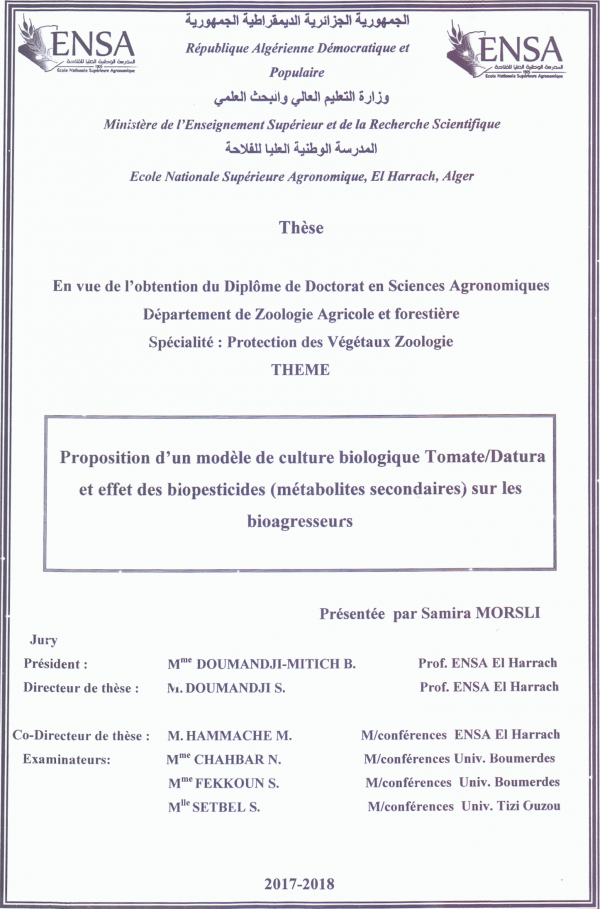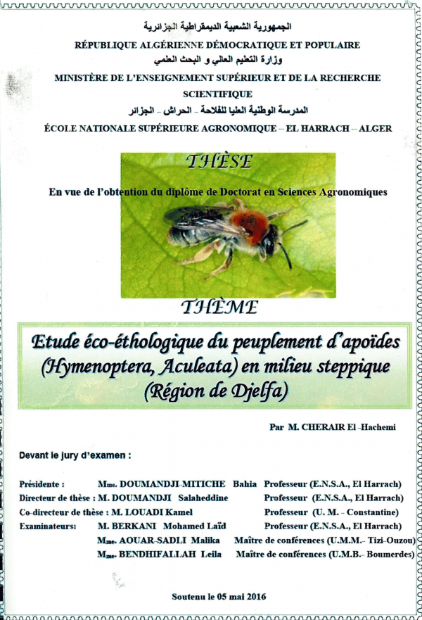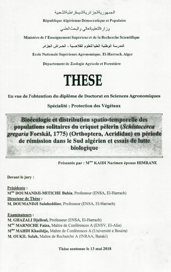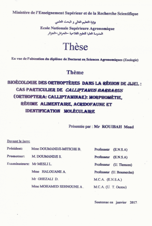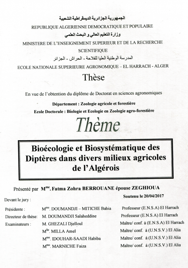Note de thèse : Th. Doct. : Agron. Doctorat ENSA : département de Zoologie Agricole
