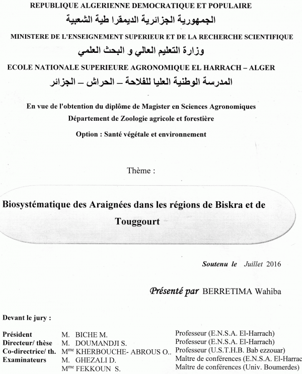 Biosystématique des Araignées dans les régions de Biskra et de Touggourt Wahiba Berretima par