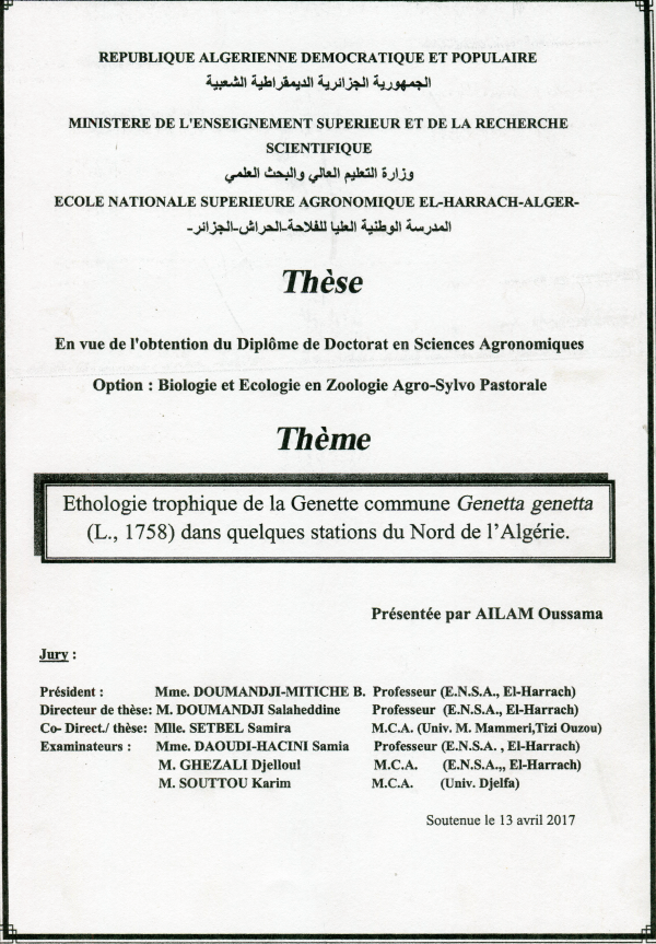Note de thèse : Th. Magister : Agron. Magister ENSA : département de Zoologie Agricole
