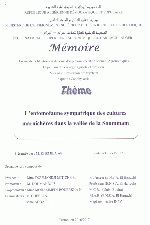L'entomofaune sympatrique des cultures maraîchères dans la vallée de la Soummam Ali Khemila par
