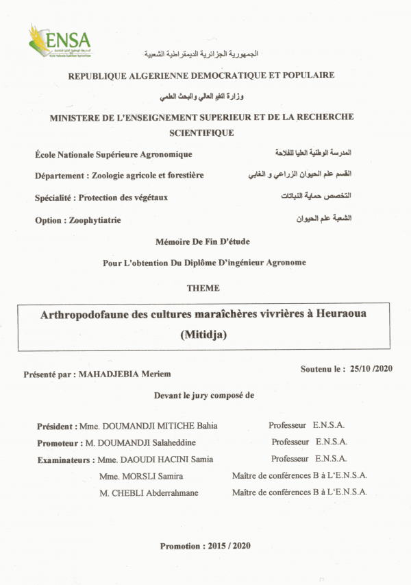 Arthropodofaune des cultures maraîchères vivrières à Heuraoua (Mitidja) Meriem Mahadjebia par