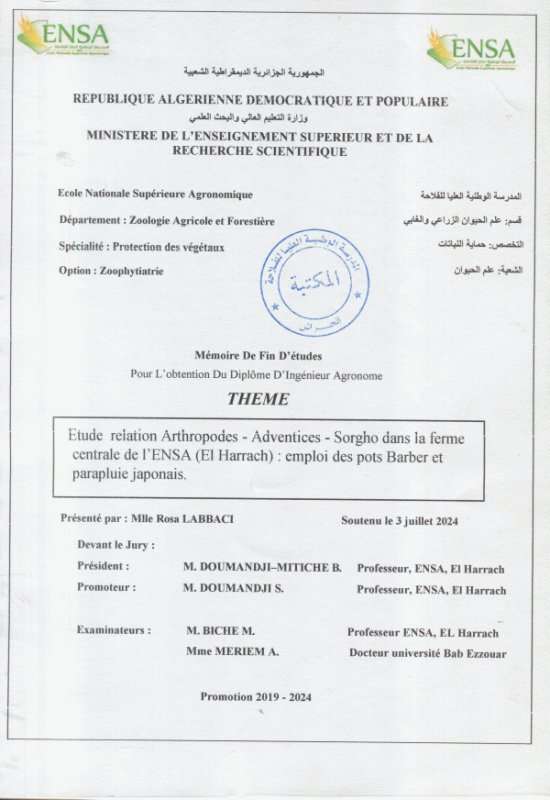 Note de thèse : Th. Magister : Agron. Magister INA : département de Zoologie Agricole